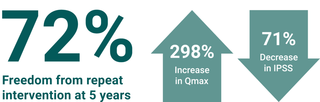 At 5 years, durability continued with 72% FFRI* 1, with a 298% increase in Qmax* (Baseline 5mL, 5-year 19.9mL)¹ and a 71 decrease in IPSS* (Baseline 22.5, 5-year 7.2).¹ Qmax & IPSS are using FCF* rates – Includes worst observed value carried forward for subjects undergoing repeat intervention of the study stricture (i.e. clinical failures).